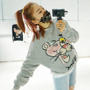 Adkhal经典爆款粉红豹水洗加绒卫衣女韩版潮流圆...