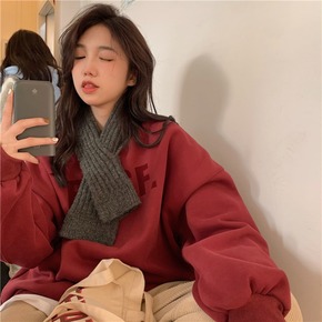 春秋红色青少年纯棉纯色毛圈不加绒落肩前兜套头连帽休...