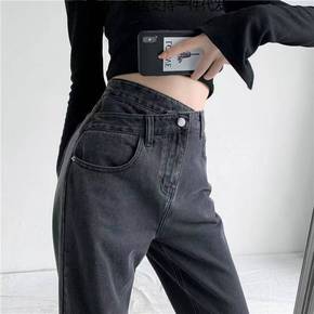 牛仔新款高腰设计感交叉腰头牛仔裤女显瘦宽松直筒裤长...