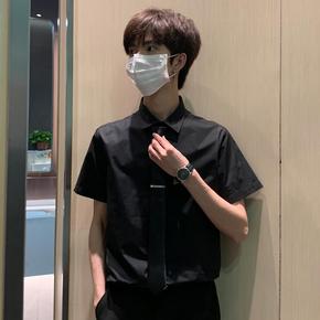 领带短袖衬衫男夏季韩版潮流黑衬衣ins潮男港风帅气...