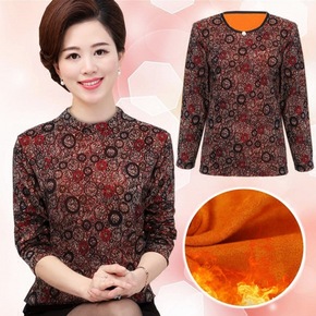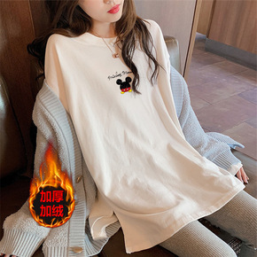 大码秋冬加绒磨毛螺纹棉打底衫女长袖圆领恤修身内搭百...