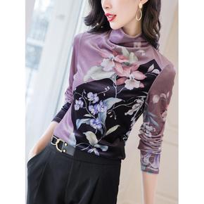 紫色金丝绒打底衫女新款时尚印花套头长袖内搭打底衫...