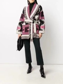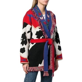跨境欧美秋冬流苏开衫外套女粉白黑拼色提花系带收腰中...