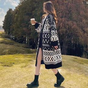 跨境秋冬新款大翻领提花波西米亚毛衣开衫欧美宽松中长...