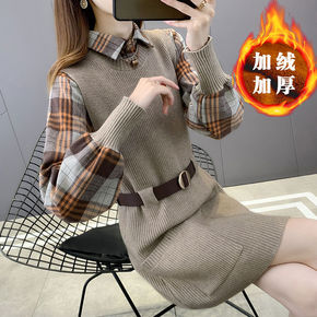 新款复古半身裙套装女冬2021菱格撞色圆领毛衣+显...