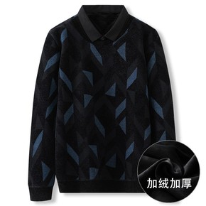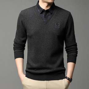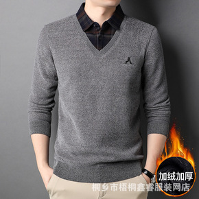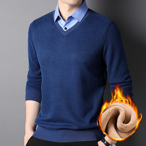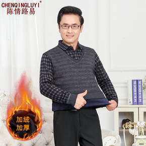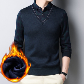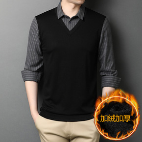 中年男士毛衣加绒加厚假两件上衣针织打底衫保暖中老年...