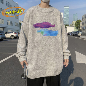 2021冬原创炫彩云朵印花加绒加厚毛衣男基地景宽松...