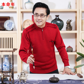 羊毛假两件毛衣男衬衫领加绒加厚中老年人爸爸本命年红...