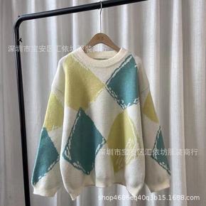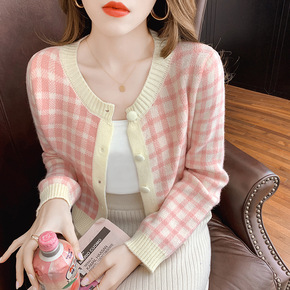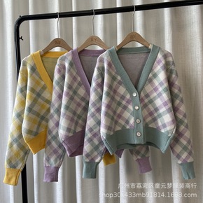 格子毛衣外套女2021秋冬季新款韩版宽松短款针织开...