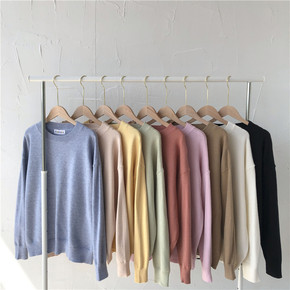 2021新款女士圆领套头纯色细毛线通勤针织衫韩版秋...