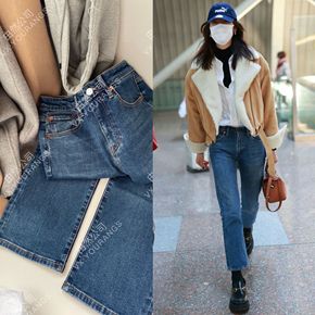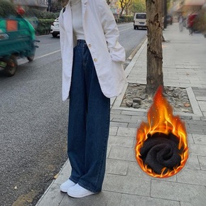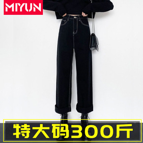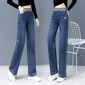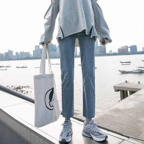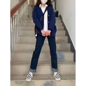 新款深蓝色牛仔裤女秋冬高腰显瘦宽松学生直筒阔腿裤老...