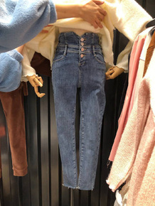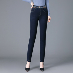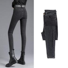 女式牛仔裤长裤九分小脚裤女高腰加绒牛仔裤弹力修身灰...