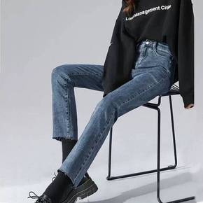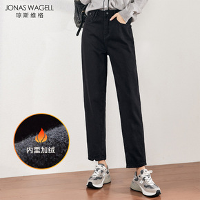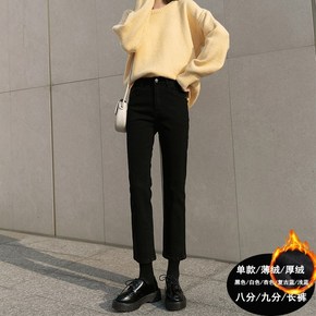 黑色加绒牛仔裤女2021春秋新款加长高腰弹力显瘦修...