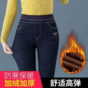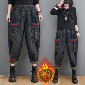 胖妹妹加绒加厚牛仔裤女拼色百搭休闲萝卜长裤显瘦小脚...