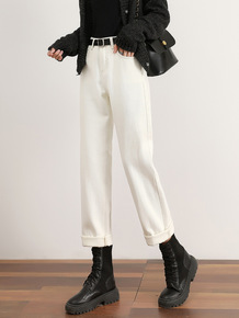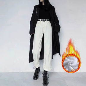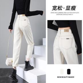 白色牛仔裤女秋装2022年新款高腰宽松加绒直筒萝卜...