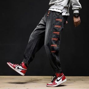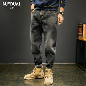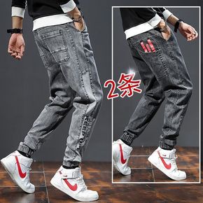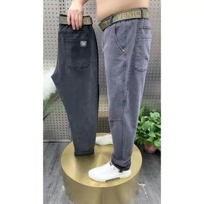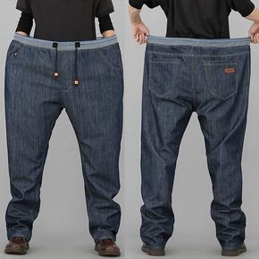 加肥牛仔裤男宽松潮牌大码哈伦束脚裤胖子粗腿松紧腰收...