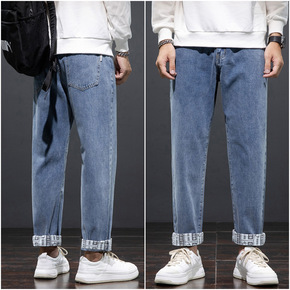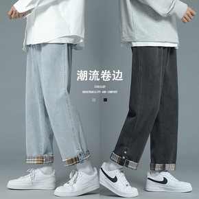 格子卷边牛仔裤男春秋2021年新款宽松直筒设计感小...