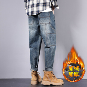 秋冬加绒加厚牛仔裤男宽松大码纯色日系潮牌肥佬裤加肥...