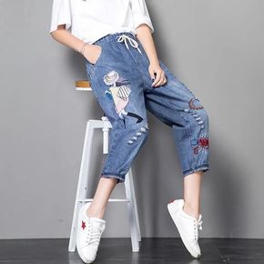 破洞刺绣九分牛仔裤女2022夏秋款显瘦宽松学生贴布...