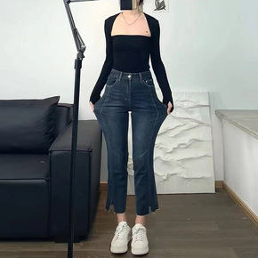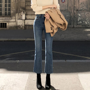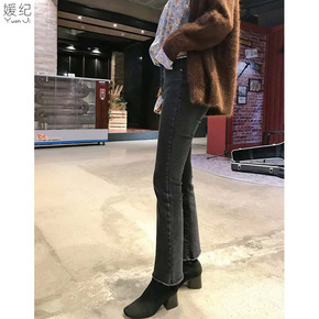 女士微喇牛仔裤女2022春装新款高腰显瘦烟灰色九分...