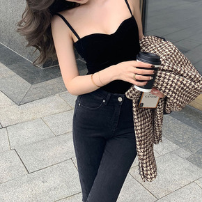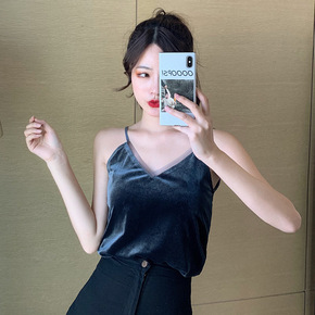 丝绒拼接网纱V领吊带上衣春夏款外穿大码宽松性感西服...