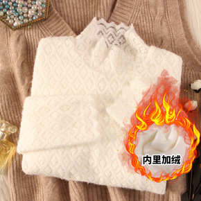 加绒加厚打底衫女秋冬季大码宽松蕾丝保暖上衣显瘦中长...