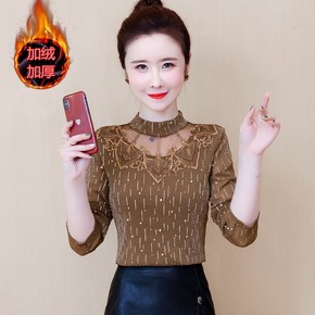 蕾丝打底衫女长袖t恤2021秋冬新款加绒加厚网纱上...
