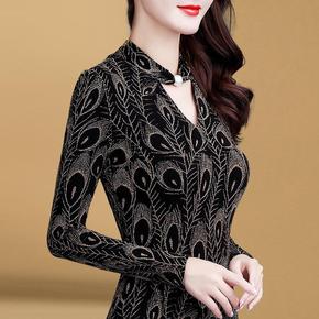 秋冬加绒加厚网纱打底衫女高领长袖T恤时尚印花修身上...