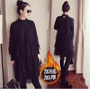 加绒加厚蕾丝连衣裙女长袖2021年秋冬季中长款宽松...