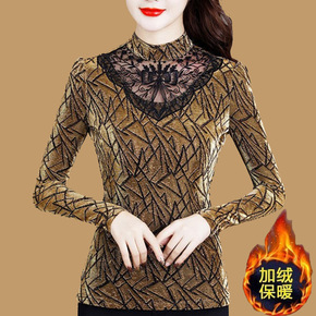 秋冬装新款加绒加厚蕾丝打底衫女士大码T恤长袖网纱上...