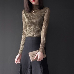 2021新款高领亮丝网纱加绒打底衫长袖T恤女闪光丝...