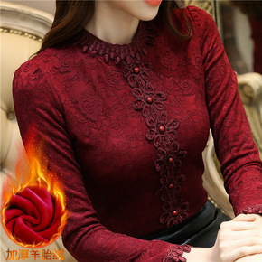 加绒/不加绒 秋冬新款修身显瘦蕾丝打底衫女长袖t恤...