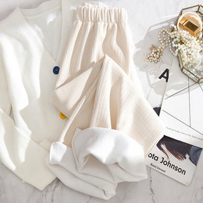 米白色雪尼尔阔腿裤女秋冬季加绒加厚高腰垂感加长直筒...