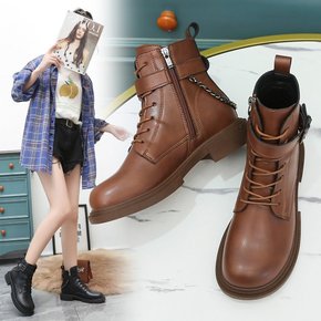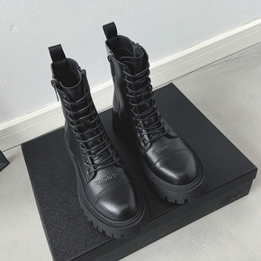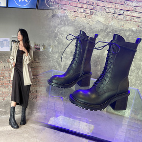 靴子女2021秋季新款厚底粗跟马丁靴女牛皮mona...