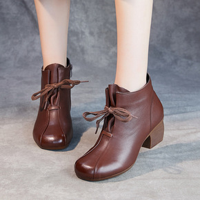 2021秋冬新款复古民族风头层牛皮妈妈靴子蕾丝蝴蝶...