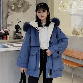 反季魔术贴羽绒服女中长款加厚修身工装大毛领收腰冬季...