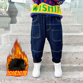 男童加绒加厚秋冬款2021韩版中大童拼接后口袋皮标...
