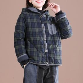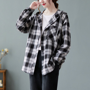 休闲连帽外套女厚款2021新款大码外搭格子衬衫长袖...