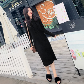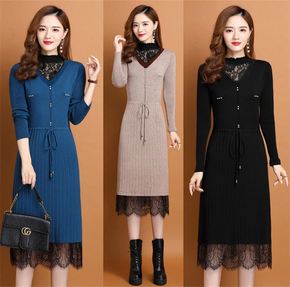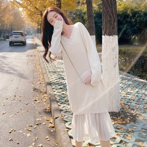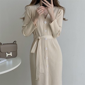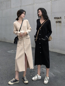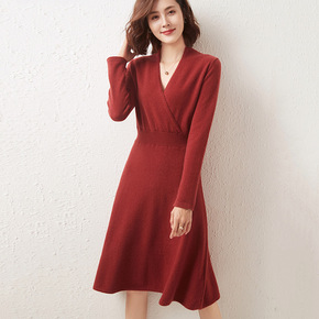 v领针织连衣裙显瘦毛衣女秋装长裙子2019新款打底...