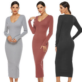 秋冬新款韩版时尚V领中长款修身包臀针织毛衣长裙鱼尾...