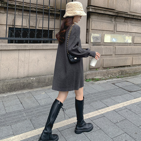 秋冬胖mm显瘦洋气过膝连衣裙加肥加大码200斤毛衣...