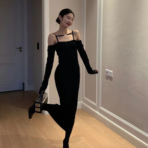 法式高级感镂空一字露肩设计感小众打底毛衣裙修身针织...