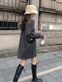 秋冬季温柔御姐风长裙毛衣针织衫v领法式长袖设计感打...