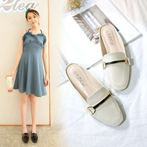 包头半拖鞋女ZA2021夏季新款尖头搭扣饰平底凉拖...