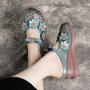 头层牛皮包头半拖鞋女外穿真皮平底圆头百搭轻便厚底拖...