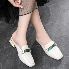 包头半拖鞋女2021新款网红英伦百搭真皮中跟粗跟方...