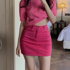 玫红色牛仔半身裙女夏季2022新款紧身包臀高腰显瘦...