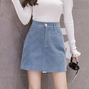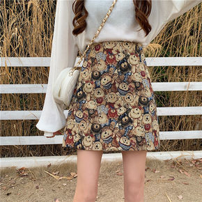 2020秋冬复古风印花小熊半身裙大码高腰毛呢a字裙...