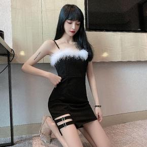 秋冬新款时尚性感羽毛抹胸吊带连衣裙修身收腰显瘦包臀...