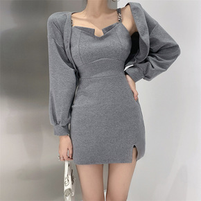 辣妹链条吊带连衣裙女秋冬收腰别致性感开叉包臀裙子套...